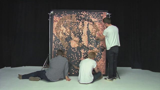 An interactive installation for Coutts bank. As more penny donations are received the more the image is revealed. Each bank displays a different image from Coutts' historic archive. Video shows a working prototype of 7,200 pennies.